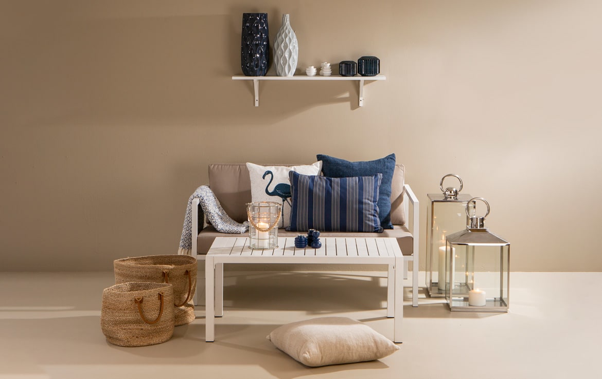 Interiør i maritim blå og hvit er en klassisk stil som mange liker. Hos Festival as får du et utvalg av varer til vår og sommer i denne populære stilen, for både inne- og utendørs bruk. Vi har satt sammen et forslag til en klassisk kolleksjon for deg i beige, blått og hvitt, med blanke og naturlige innslag.